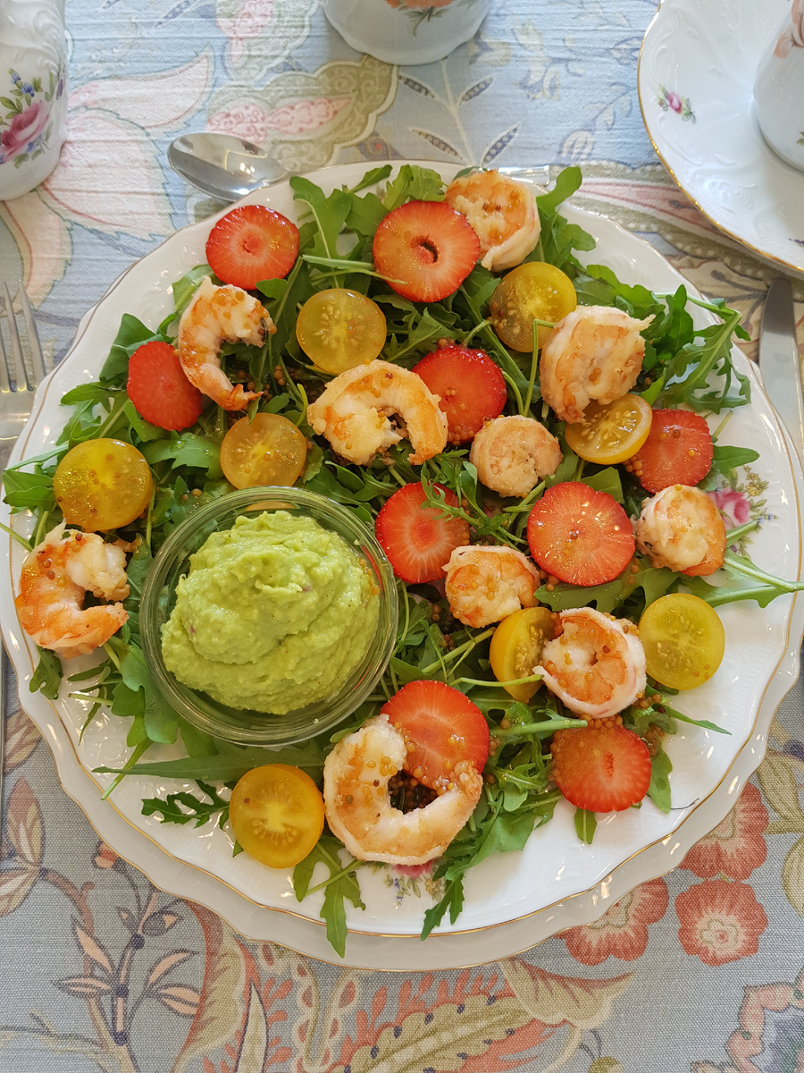 Клубнику и помидоры нарежьте и выложите на сервировочную тарелку. В соусник поместите гуакамоле, а рядом расположите промытые листья рукколы, клубнику, помидоры и жареные креветки. Полейте салат заправкой из оливкового масла, мёда, уксуса и горчицы. Этот яркий и вкусный набор блюд станет настоящим хитом на любом летнем столе!