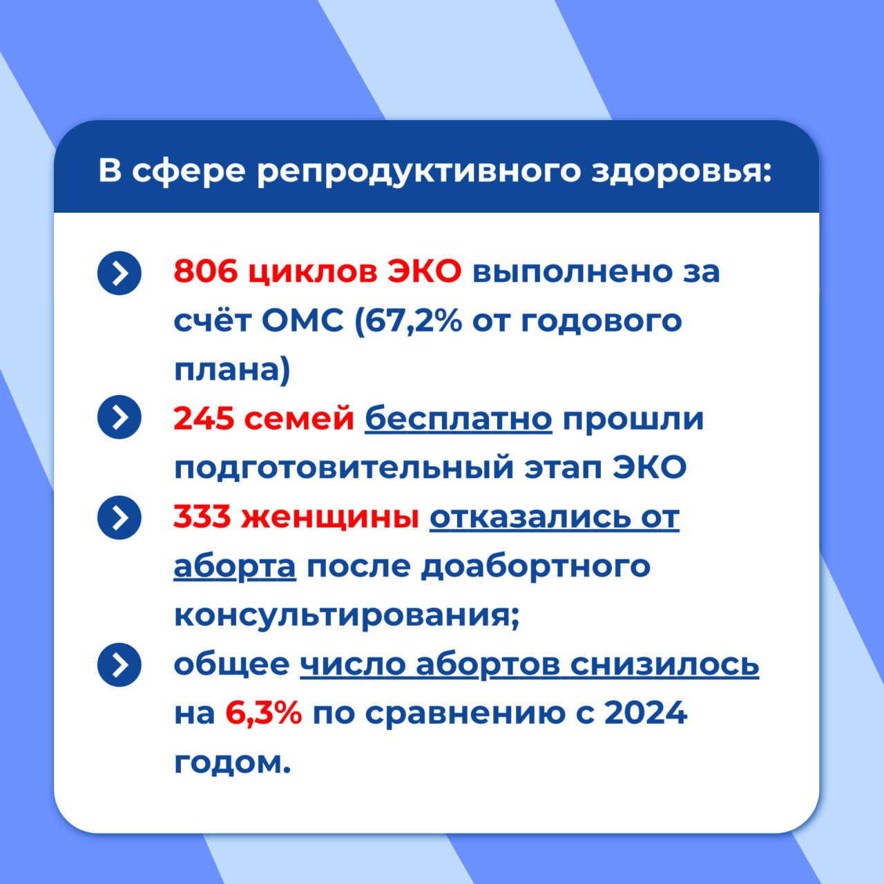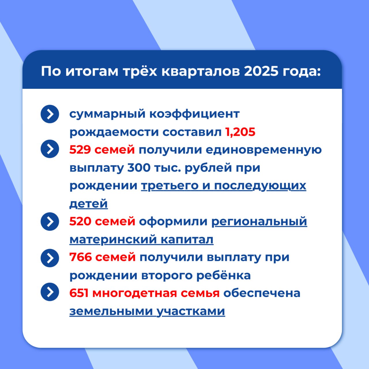 общее число абортов снизилось на 6,3% по сравнению с 2024 годом;529 молодых семей получили единовременную выплату 300 тыс. рублей при рождении третьего и последующих детей