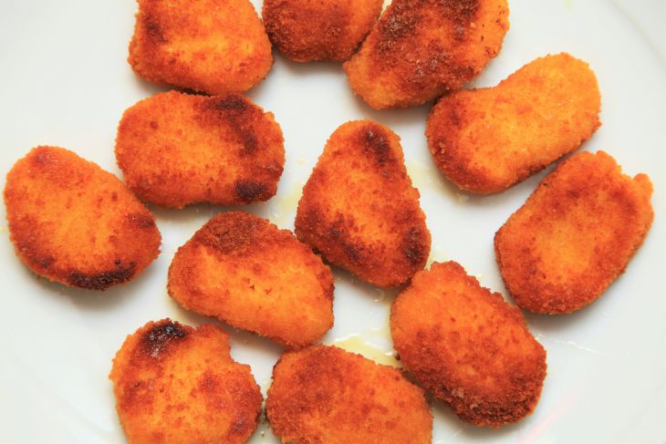 Запекать наггетсы нужно в духовке при 220 градусах на протяжении 14 минут, пока не появится золотистая корочка. Противень предварительно нужно смазать маслом.
