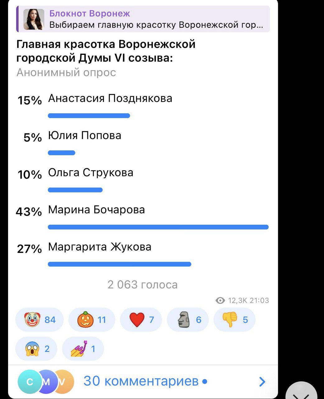 Однако на следующий день, утром 17 октября, «рейтинг красоты» изменился – на первое место вышла директор гимназии имени Басова Марина Бочарова.