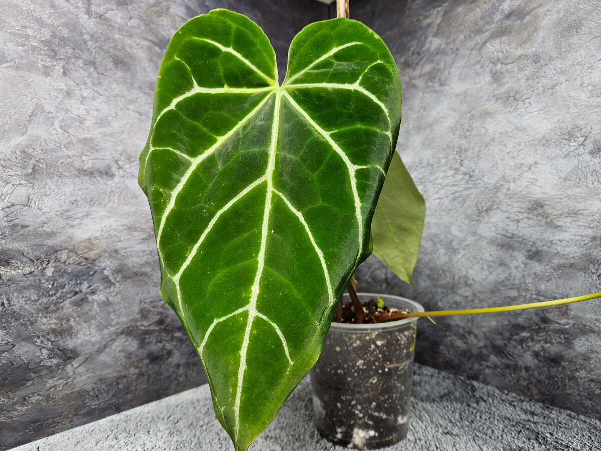 Первая радость — антуриум хрустальный. Этот сорт покорил сердца ценителей своим оригинальным обликом. Любовь к необычным антурам родилась после знакомства с антуриумом кларинервиум, который имеет сердцевидные листья. В отличие от него, у хрустального антуриума листья более вытянутые и украшены выразительными центральными прожилками. Однако главная их притягательность — это размеры: некоторые экземпляры достигают размеров ладони.