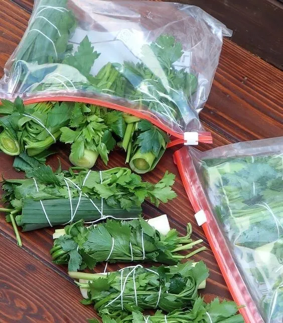 Все компоненты нужно взять в небольшом количестве, аккуратно связать и упаковать в удобные пакеты для заморозки. Благодаря этому способу зимой можно легко достать необходимую порцию и использовать в кулинарных шедеврах, не опасаясь, что зелень потеряет свои качества.