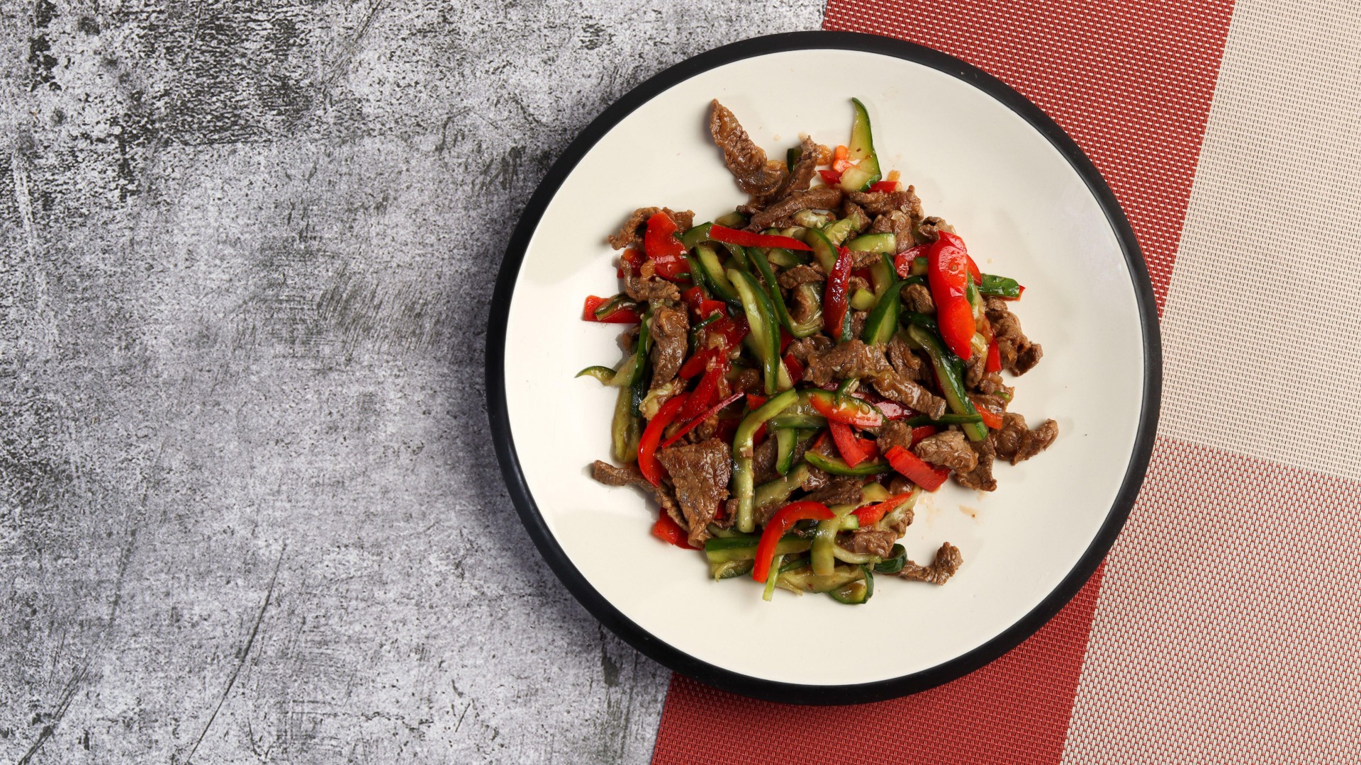 Заранее отварите 250 граммов говядины, а вечером просто достаньте ее из холодильника и нарежьте соломкой. Добавьте 200 граммов измельченных малосольных огурчиков и болгарский перец. Лучше порезать овощи так же, как мясо.