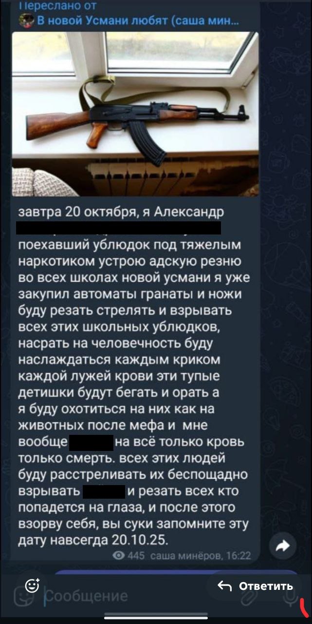- Школы работают в штатном режиме, безопасность обеспечивается в соответствии со всеми стандартами. Аккаунт админа телеграм-канала «В Новой Усмани любят» зарегистрирован на украинский номер. Александр Минеров, от чьего имени распространялись угрозы, не проживает в Воронежской области. Мы имеем дело с телеграм-каналом, созданным украинскими ЦИПсО для дестабилизации ситуации в нашей стране.