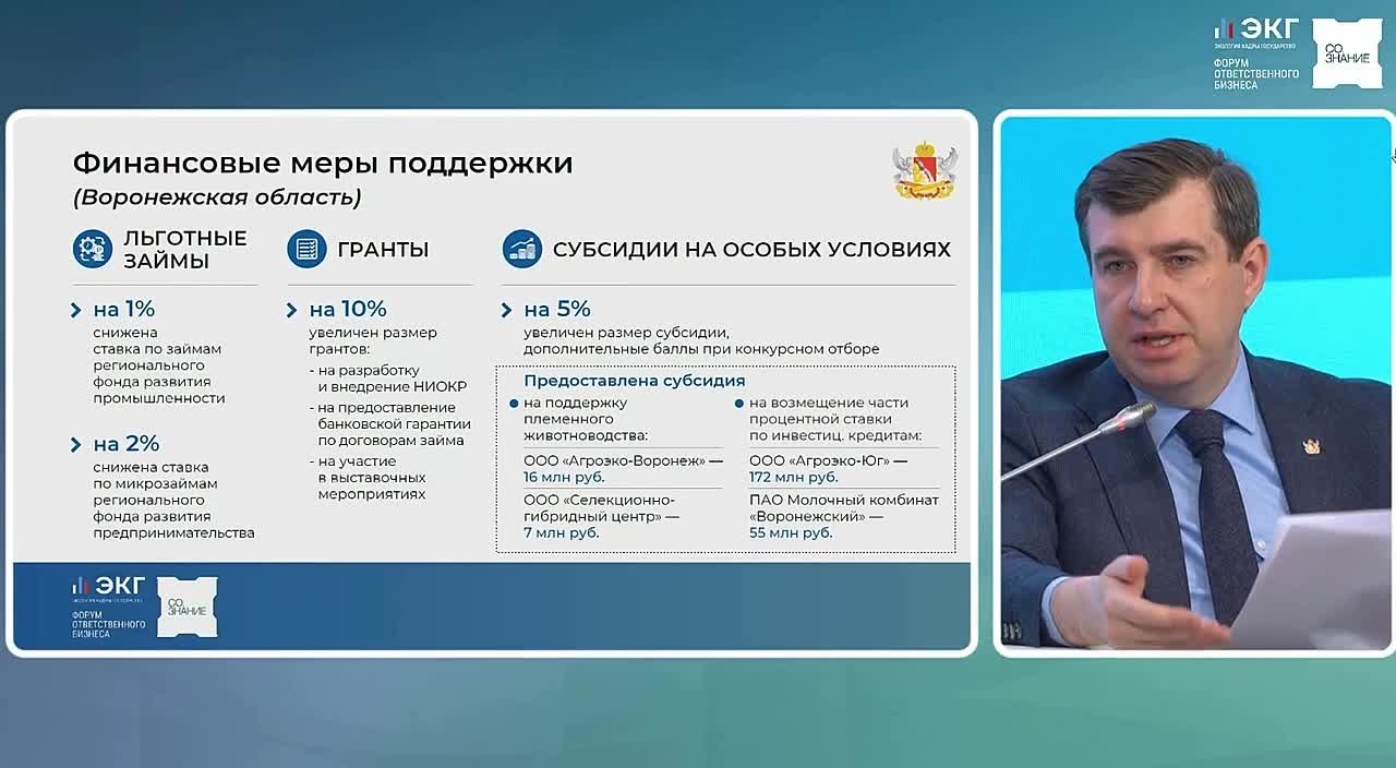 В своем докладе подробно рассказал об особых приоритетных условиях для региональных ответственных компаний: по подбору персонала, прямому контакту с руководством региона, финансовым и нефинансовым мерам поддержки, а также об использовании ЭКГ-рейтинга в госзакупках в 2024–2025 годах, где Воронежская область является лидером,