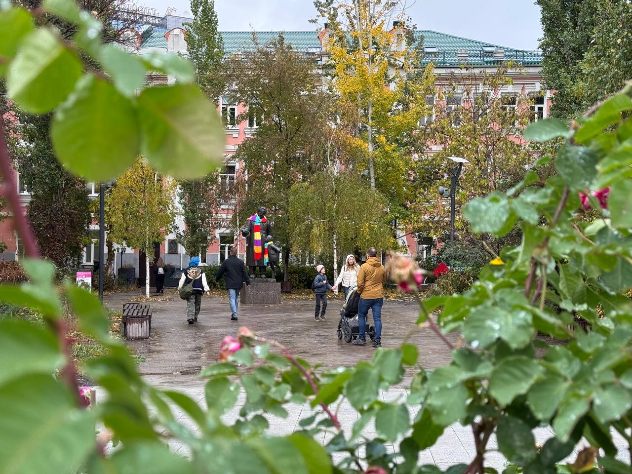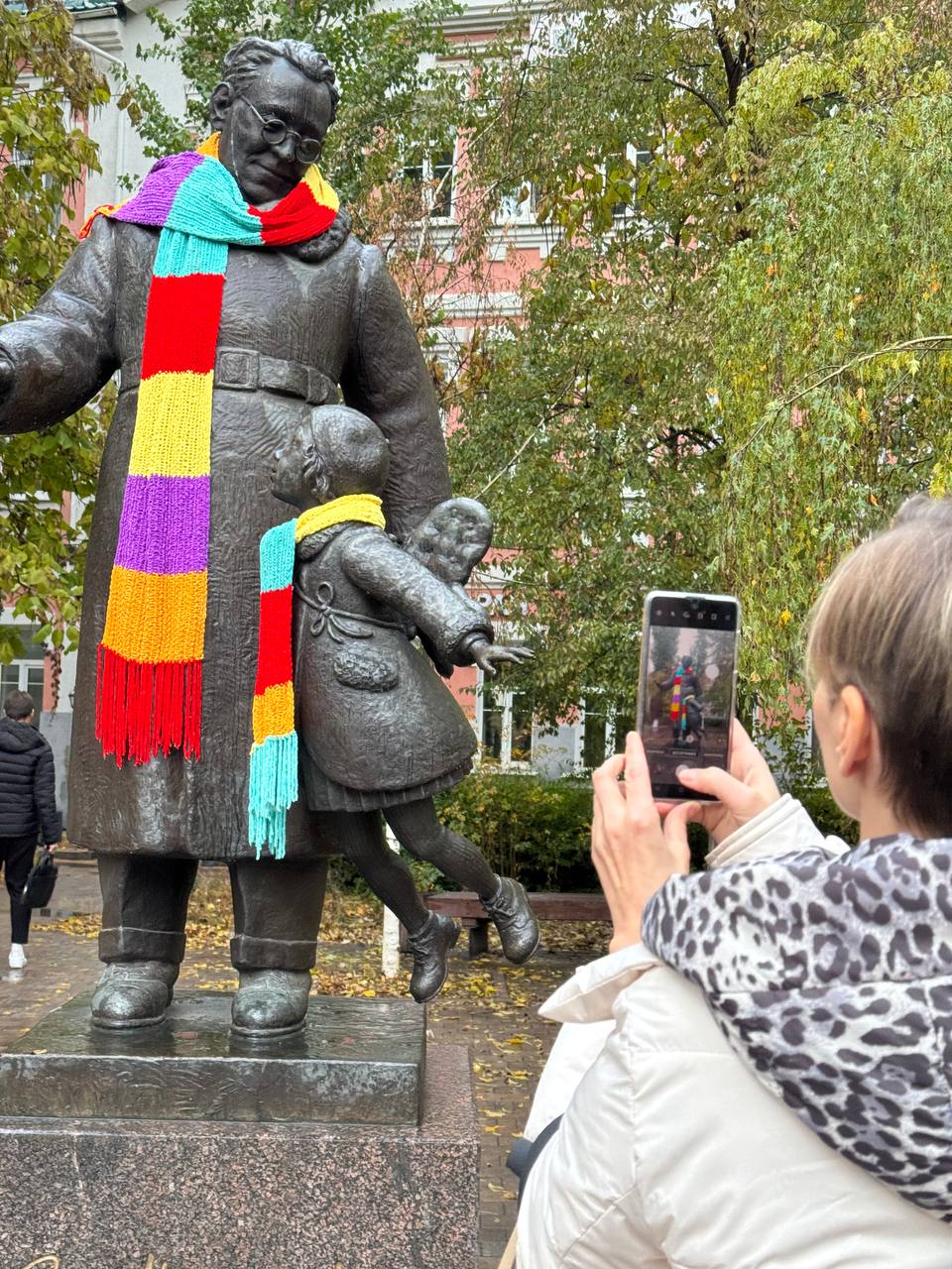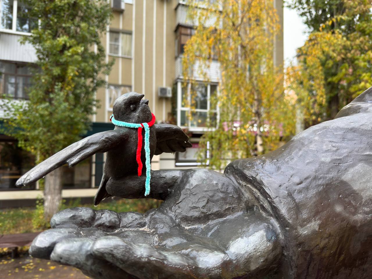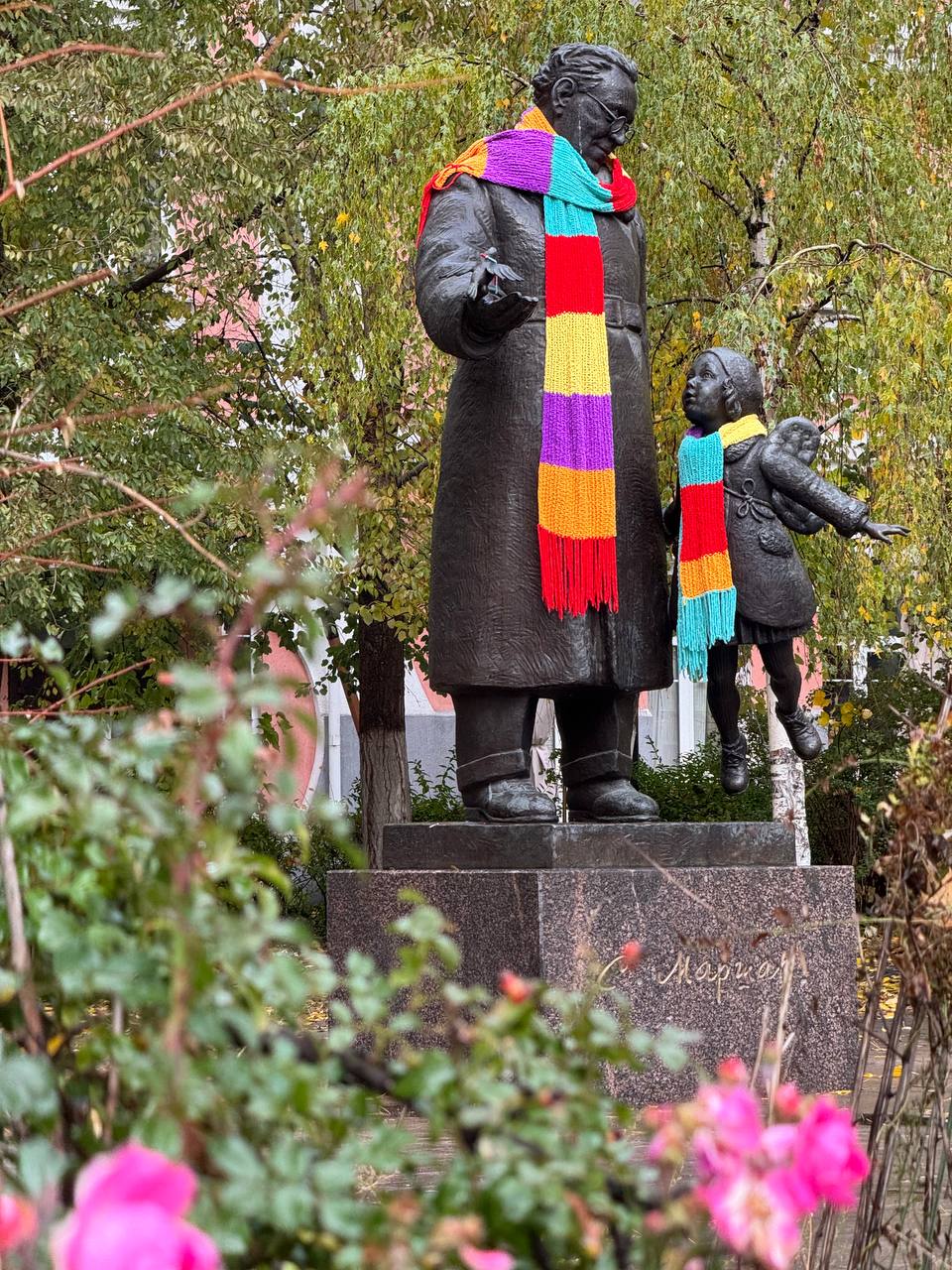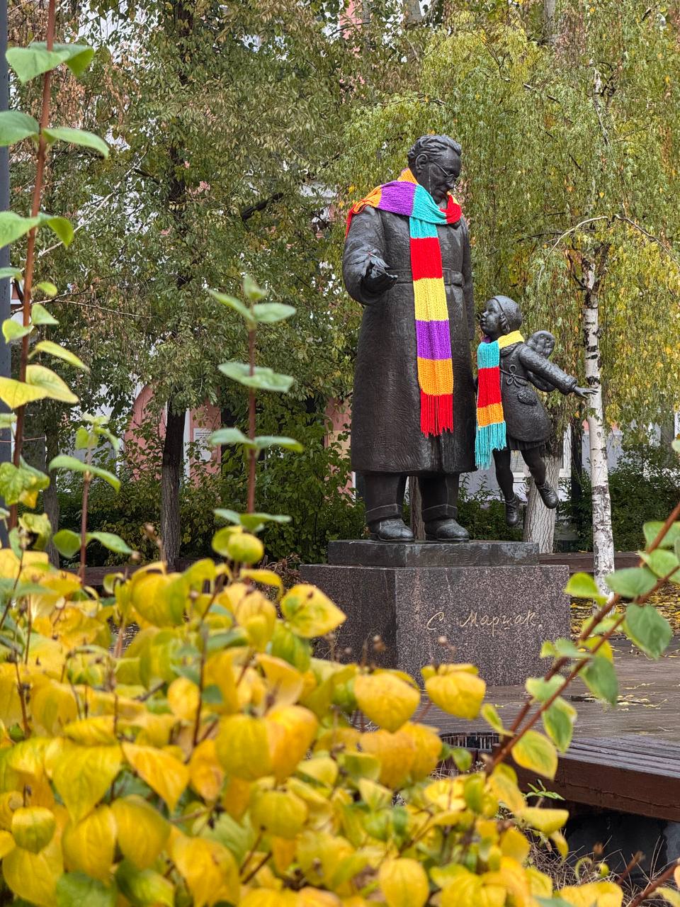В преддверии XI детского театрального фестиваля МАРШАК, бронзовый поэт «утеплился» и облачился в яркий, многоцветный шарф, словно готовясь к осенней прохладе и праздничному настроению.