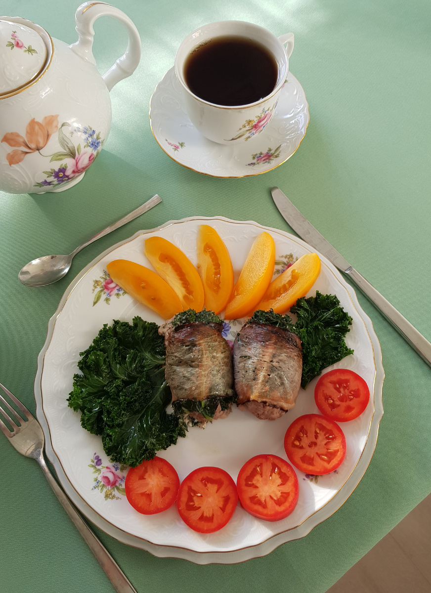По готовности блюдо можно подать на стол с холодной кудрявой капустой, заправленной растительным маслом, бальзамическим уксусом и соевым соусом. Не забудьте добавить нарезанные свежие помидоры для яркости и свежести на тарелке. Приятного аппетита!