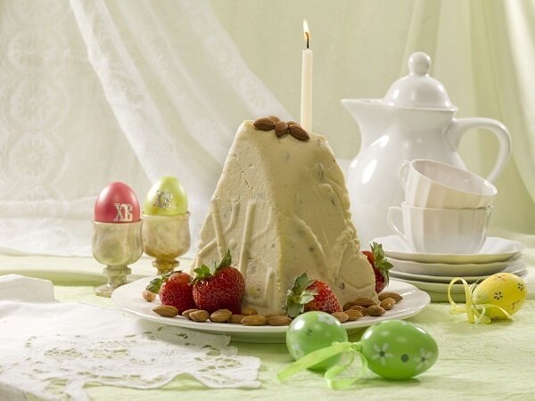 По истечении времени аккуратно извлечь пасху из формы и украсить свежими фруктами и орехами. Это лакомство несомненно станет звездой любого пасхального стола.