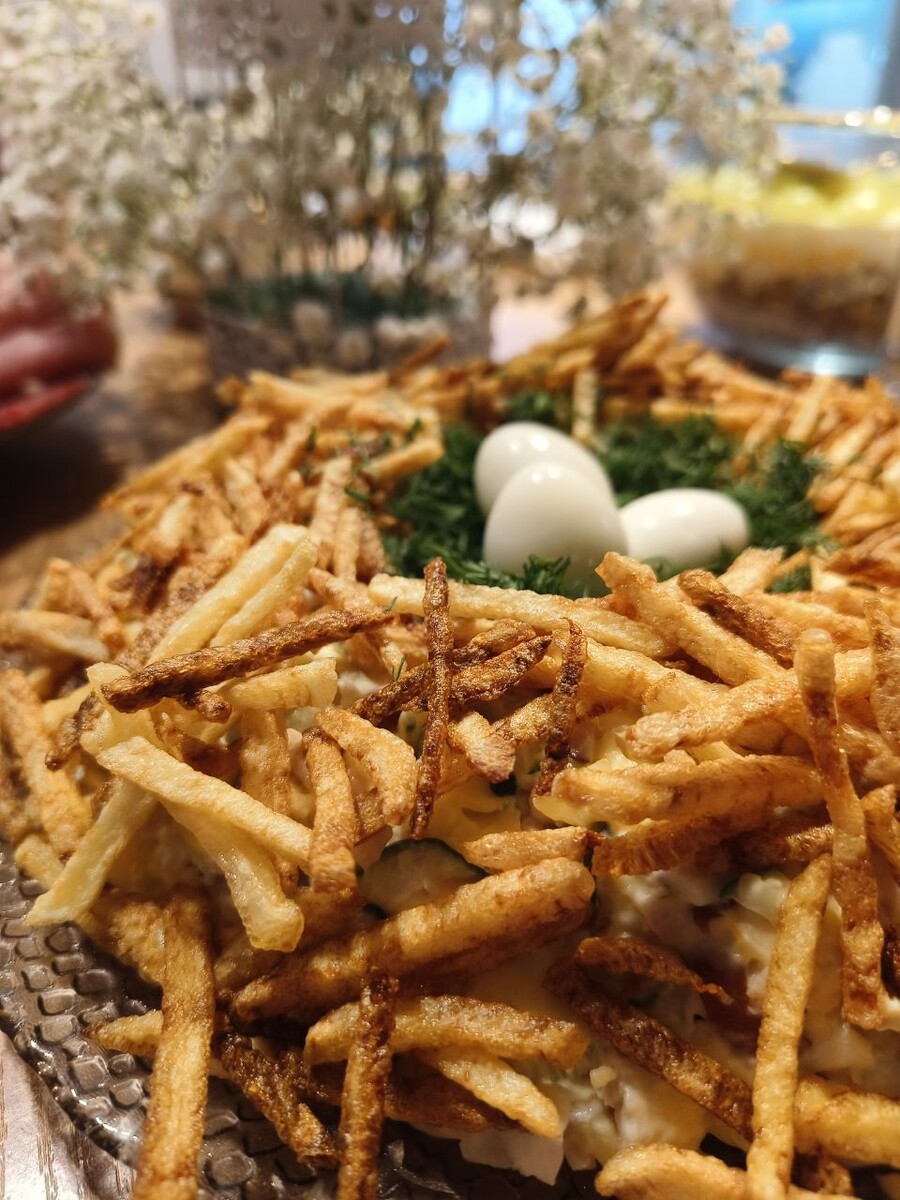 - Игра контрастов: Комбинация нежного майонеза и соленых огурцов с хрустящим картофелем делает вкус ярким и запоминающимся.