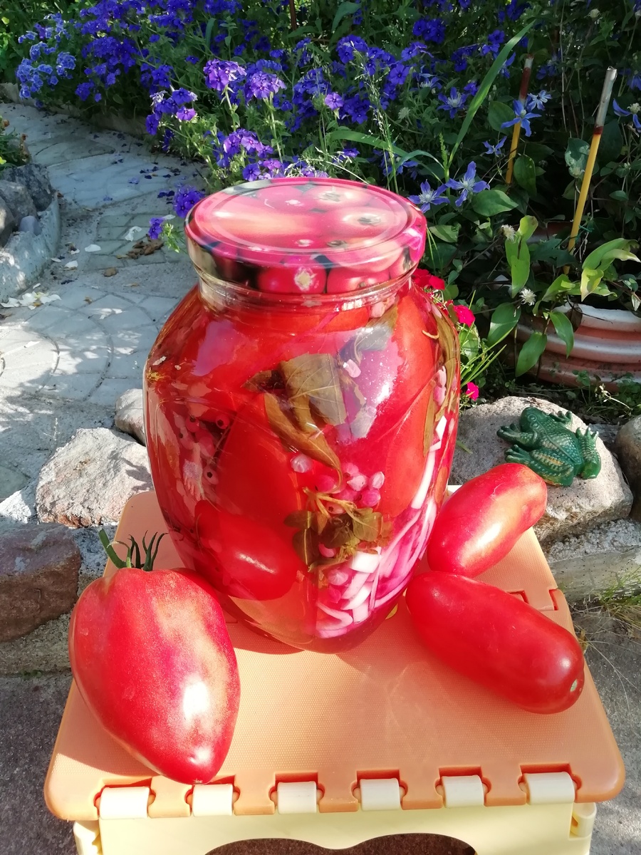 И вот, результат — яркие помидоры в красивой заливке, которые станут отличным дополнением к любому столу. Так что вместо раздумий о том, что подарить, можно смело идти в кухню и готовить не одну баночку для себя и других. Приятного аппетита!
