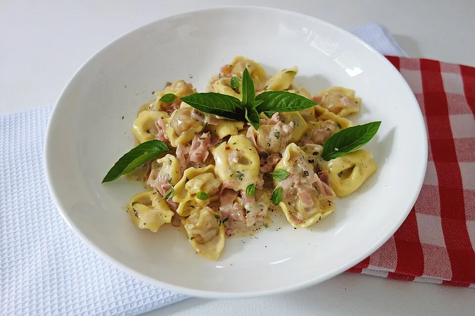 1. В глубокой кастрюле вскипятить воду и отваривать тортеллини до полуготовности. Пока они готовятся, нарезать бекон или ветчину мелкими кубиками и обжарить на сковороде с небольшим количеством масла до получения золотистой корочки.