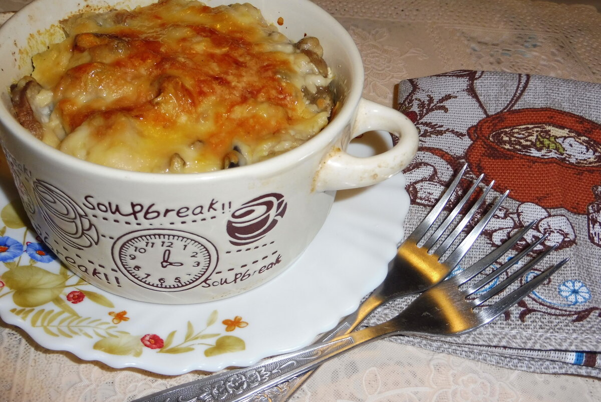 Сначала необходимо нарезать оставшиеся кусочки куриного шашлыка мелкими частями и распределить их по кокотницам. Затем на курицу следует положить маринованные белые грибы и мелко нарезанный лук. Это создаст основу для вашего жюльена, где каждый ингредиент прекрасно дополнит друг друга, образуя уникальный вкус.