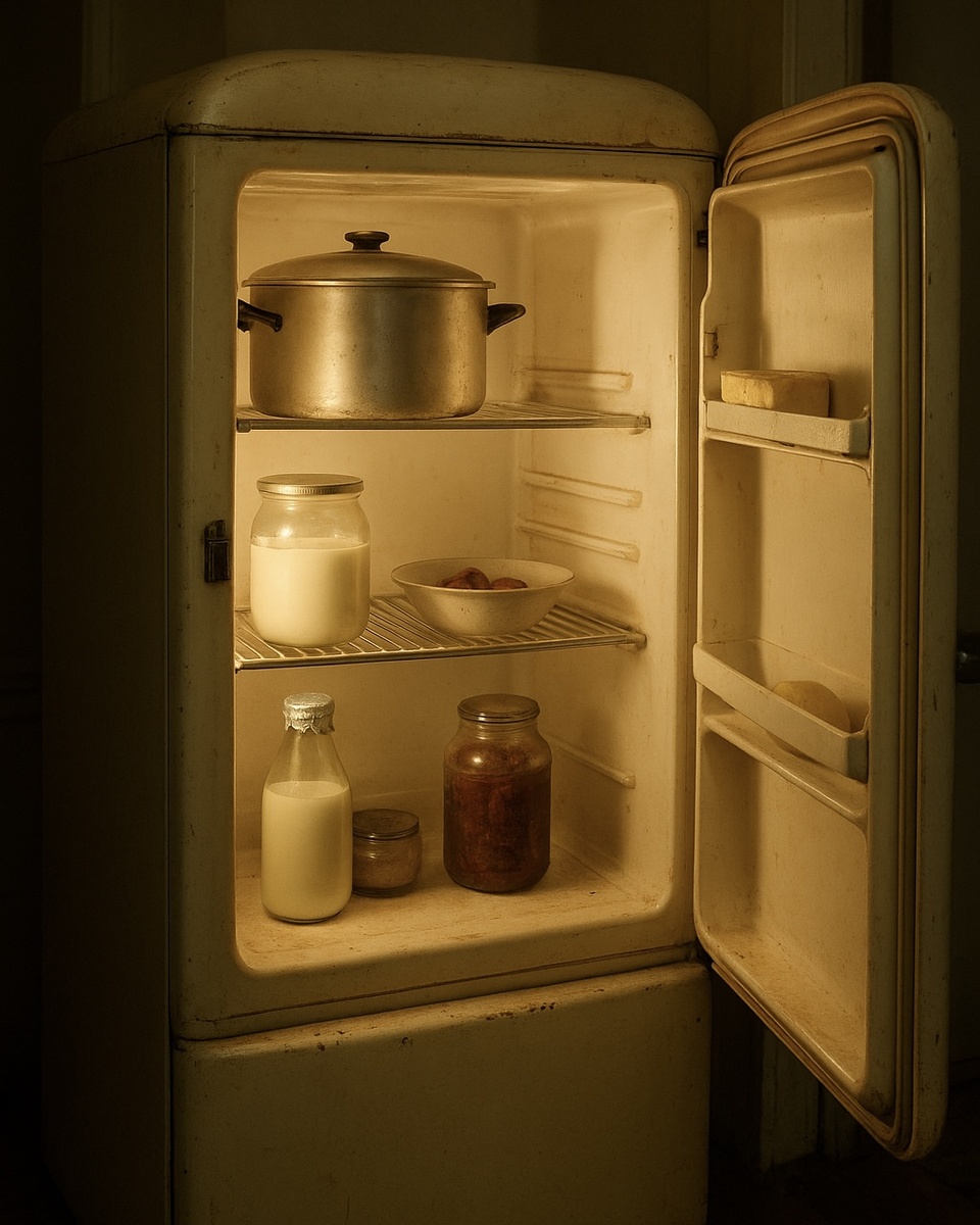 Нижняя полка обычно была в распоряжении более «тяжёлых» продуктов. Там прятались кусочки варёной колбасы, иногда даже шпроты на праздник. Мясо же хранили в мисках или кастрюлях, никаких лишних оберток и упаковок — только натуральные продукты от местных фермеров. В дополнение к мизерным запасам животного белка всегда можно было найти картошку и морковь, завернутые в газету — предметы, которые символизировали надежность солений на зиму.