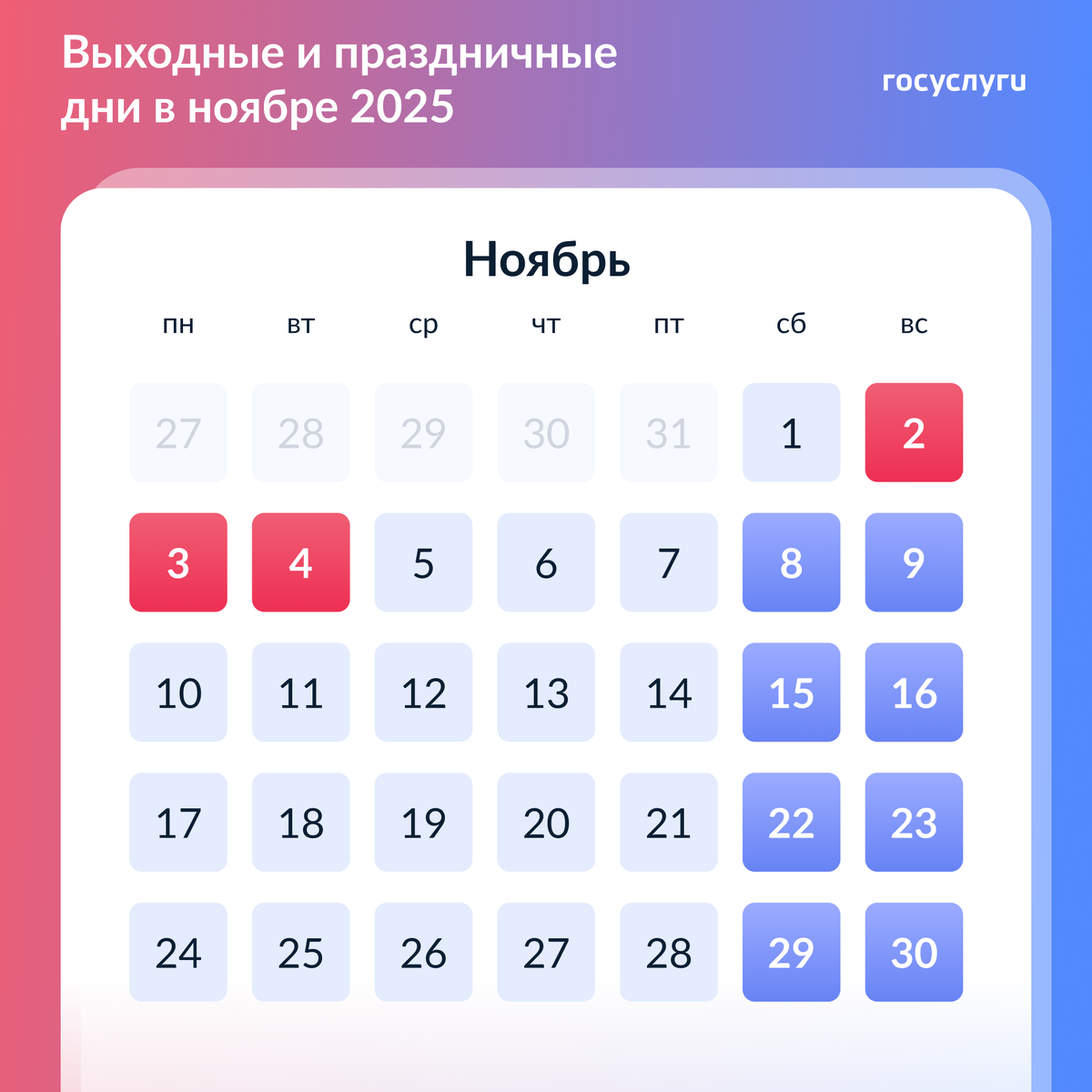 Итак, с 2 по 4 ноября наступят долгожданные выходные. Эти три дня отдыха, которые выпадают на воскресенье, понедельник и вторник, обеспечат отличную возможность расслабиться и насладиться временем с семьей или друзьями. Стоит отметить, что суббота, 1 ноября, будет рабочим днем. Это решение связано с переносом выходного дня на понедельник, чтобы образовались три дня подряд отдыха, так как вторник, 4 ноября, отмечается как День народного единства.