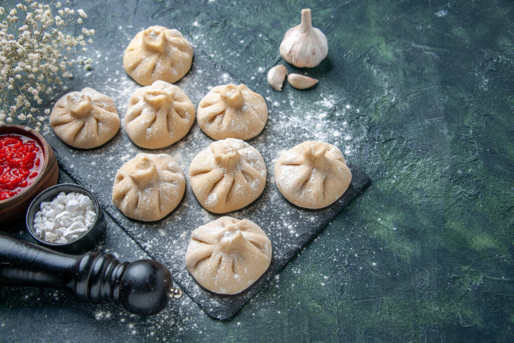 - Для начинки: 600-700 г мяса (рекомендуется использовать смесь свинины и говядины), 2-3 луковицы, 100-150 мл ледяной воды или бульона, соль и перец по вкусу, 0.5 ч. л. молотого кориандра (по желанию), зелень и 2-3 зубчика чеснока.