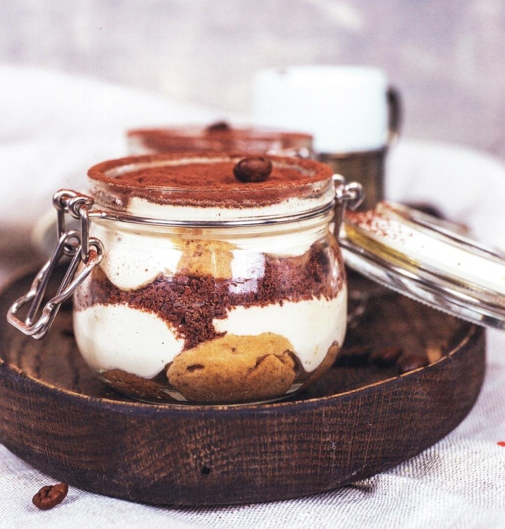 Собрав все компоненты, пропитанные бисквиты чередовать с кремом в форме или банке. В качестве финального штриха посыпать десерт какао и шоколадом, и наслаждаться невероятным вкусом!