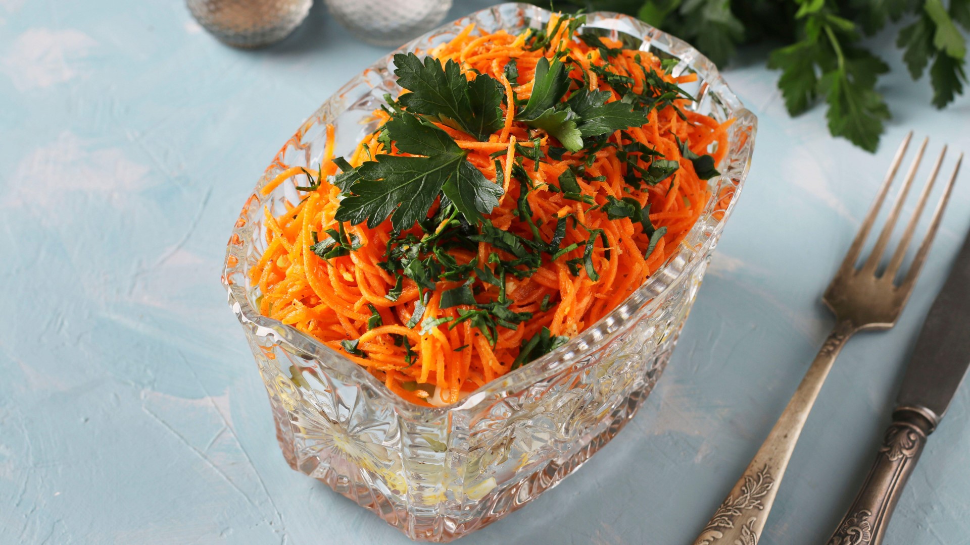 Положите сверху на салат корейскую морковку и немного зелени, советует «Лайфхакер». Готово! Можно подавать на стол.
