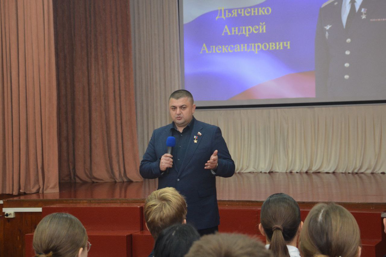 Председатель Воронежской городской Думы, Герой России Андрей Дьяченко провел Уроки Мужества для старшеклассников.