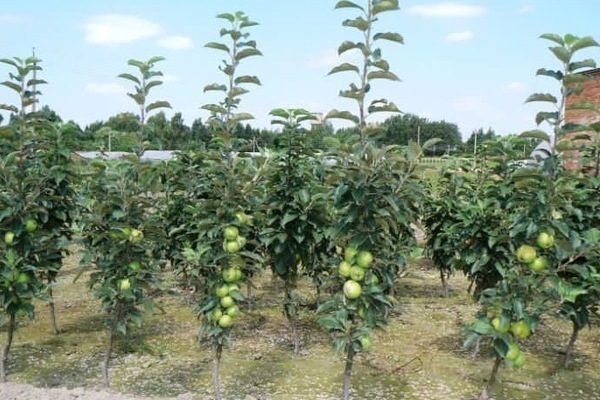 Каждое дерево достигает высоты около 2 метров и отличается почти отсутствующей кроной. Вместо этого, можно наблюдать компактное вертикальное строение с короткими ветвями, расположенными вдоль ствола. Кора у молодых яблонь бледно-зеленая, а у взрослых приобретает бурый оттенок.