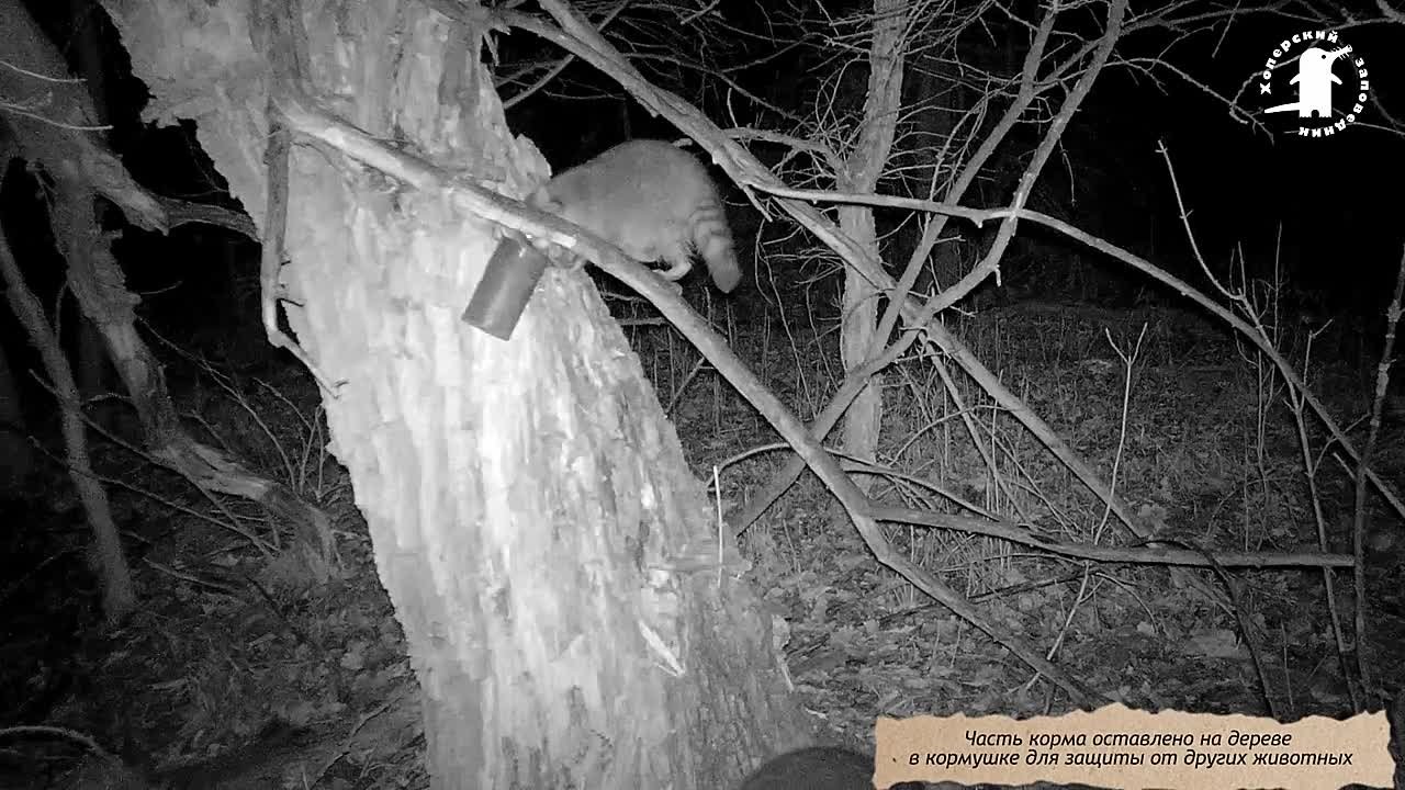 Предположительно, это самка с подросшим щенком текущего года. Для того, чтобы привлечь животных, на дереве оставили кормушку с кормом. Ее пришлось повесить довольно высоко, чтобы другие животные их не съели.