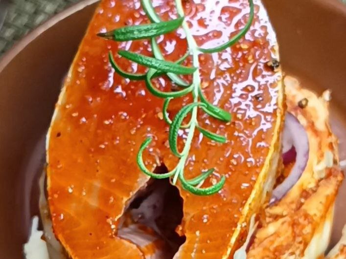 В форму для запекания ложится немного сливочного масла, на которое затем укладываются кружки пекинской капусты. Капусту нужно смазать приготовленным соусом, а затем добавить кольца лука. После этого берутся стейки форели — их также обмазывают маринадом и выкладывают на капусту. Для аромата сверху кладут веточку розмарина.