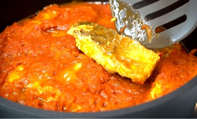 Для маринада нарезанные овощи и томаты смешиваются вместе с томатной пастой и специями, доводя до кипения. Затем на дно кастрюли выкладываются оставшиеся овощи, после чего укладывается слой рыбы, и сверху заливается маринадом. На среднем огне нужно довести до кипения, а затем уменьшить его, томя блюдо 1,5-2 часа.