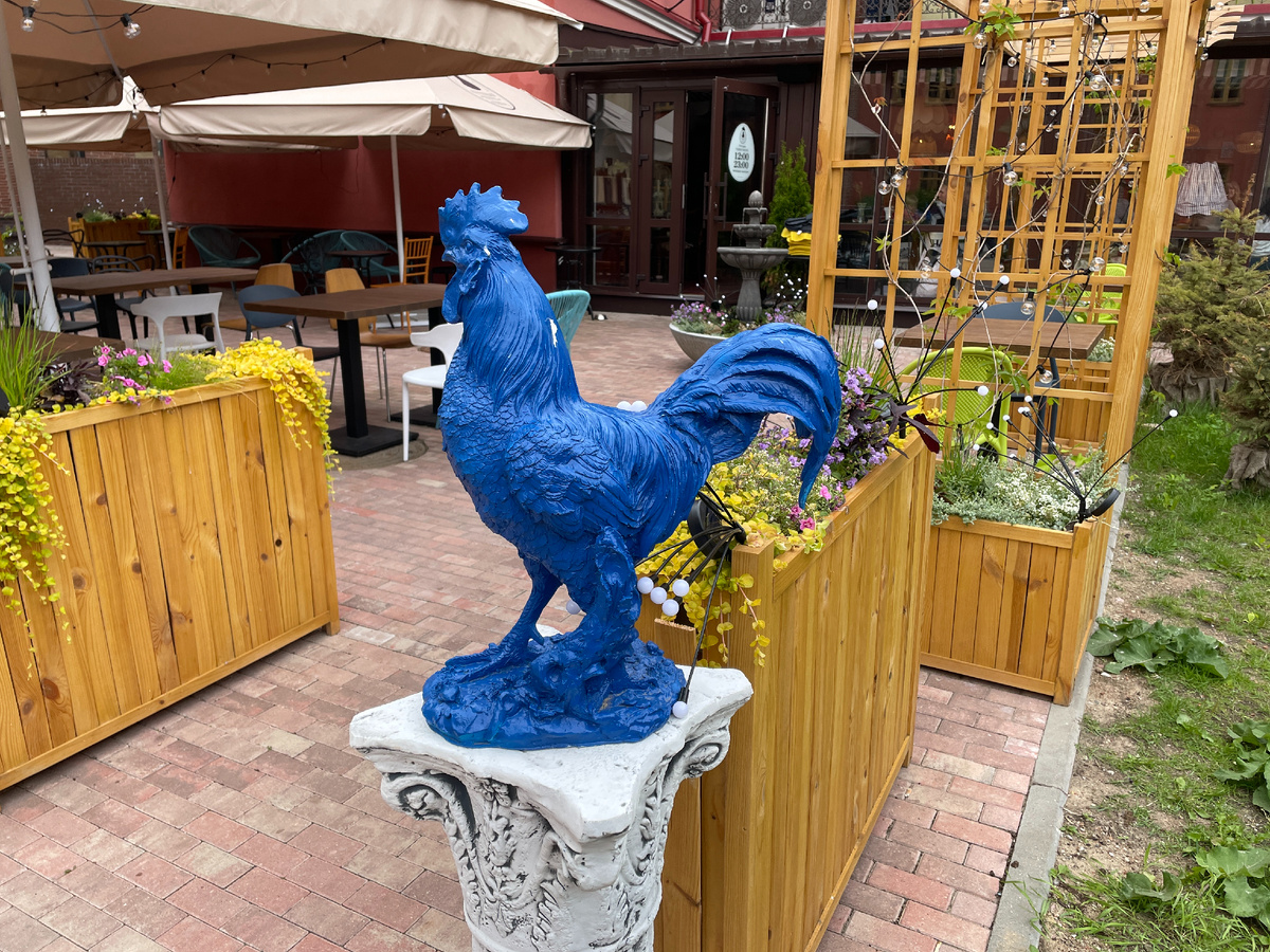 Заведение занимает три этажа, которые оформлены в едином стильном формате. Декор внутри сочетает элементы домашнего уюта: ковры на полу, мягкую мебель и оригинальные арт-объекты с изображениями кур, создают необычную, но комфортную атмосферу. Для желающих пообедать на свежем воздухе предусмотрены уютные балкончики с прекрасным видом на город.