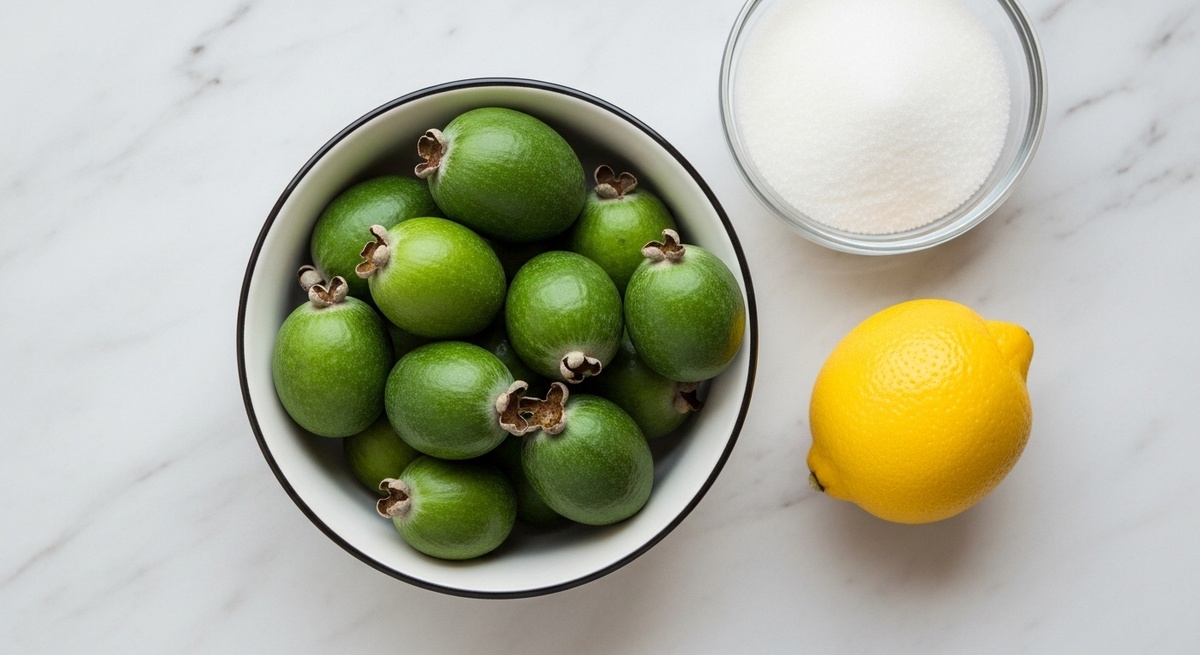- Фейхоа: 300 г — выбирайте плотные, ярко-зеленые плоды. Они должны быть свежими и достаточно твердыми.