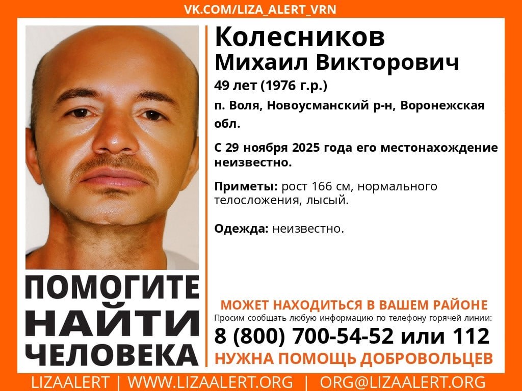 Жителей Воронежской области просят помочь найти без вести пропавшего 49-летнего Михаила Колесникова. О мужчине, который проживает с родственниками в поселке Воля Новоусманского района, нет никакой информации уже почти неделю – он не выходит на связь с семьей с субботы, 29 ноября.