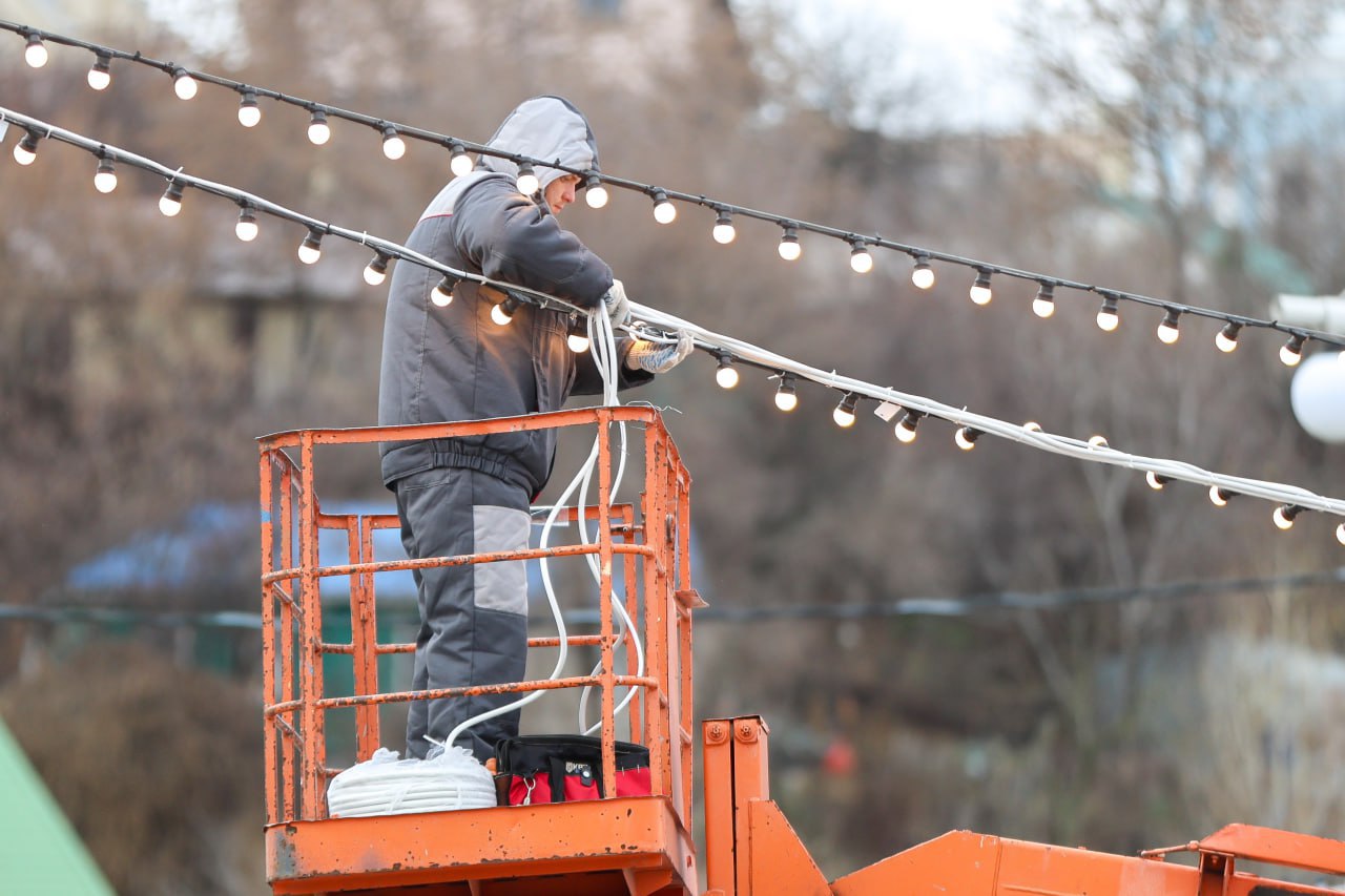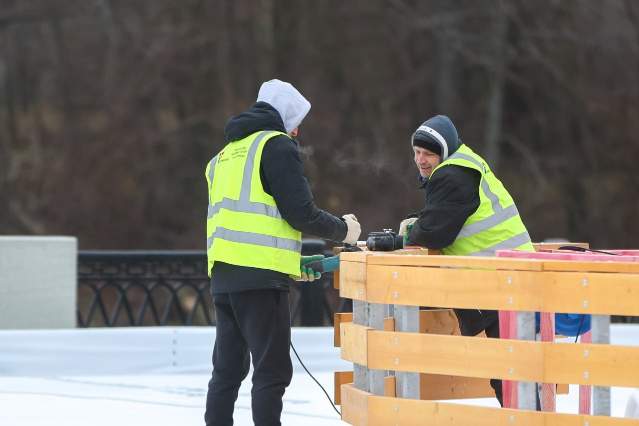 Ведется монтаж праздничной иллюминации и двух павильонов для переобувания и проката коньков. Уже установили павильон для записи видеообращений бойцам СВО. Как и в прошлом году, поздравления покажем на экране и отправим ребятам.