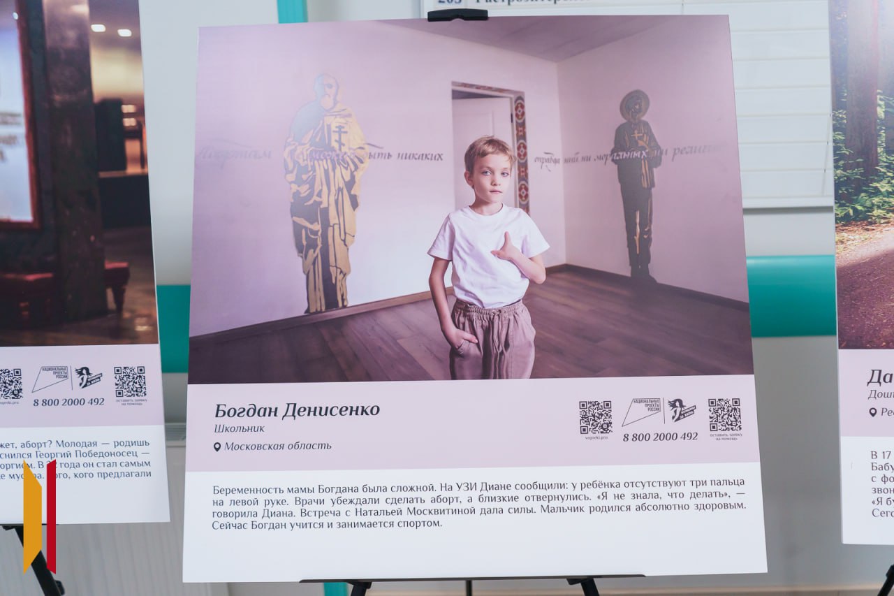 Центральное событие акции – выставка «Рожденные вопреки». Она расположилась на втором этаже детской поликлиники. На больших холстах истории тех, кто мог бы не родится по разным причинам. Министерство здравоохранения Воронежской области решило поделиться трогательными историями людей с посетителями поликлиники, плакаты гармонично вписались в обстановку медучреждения.