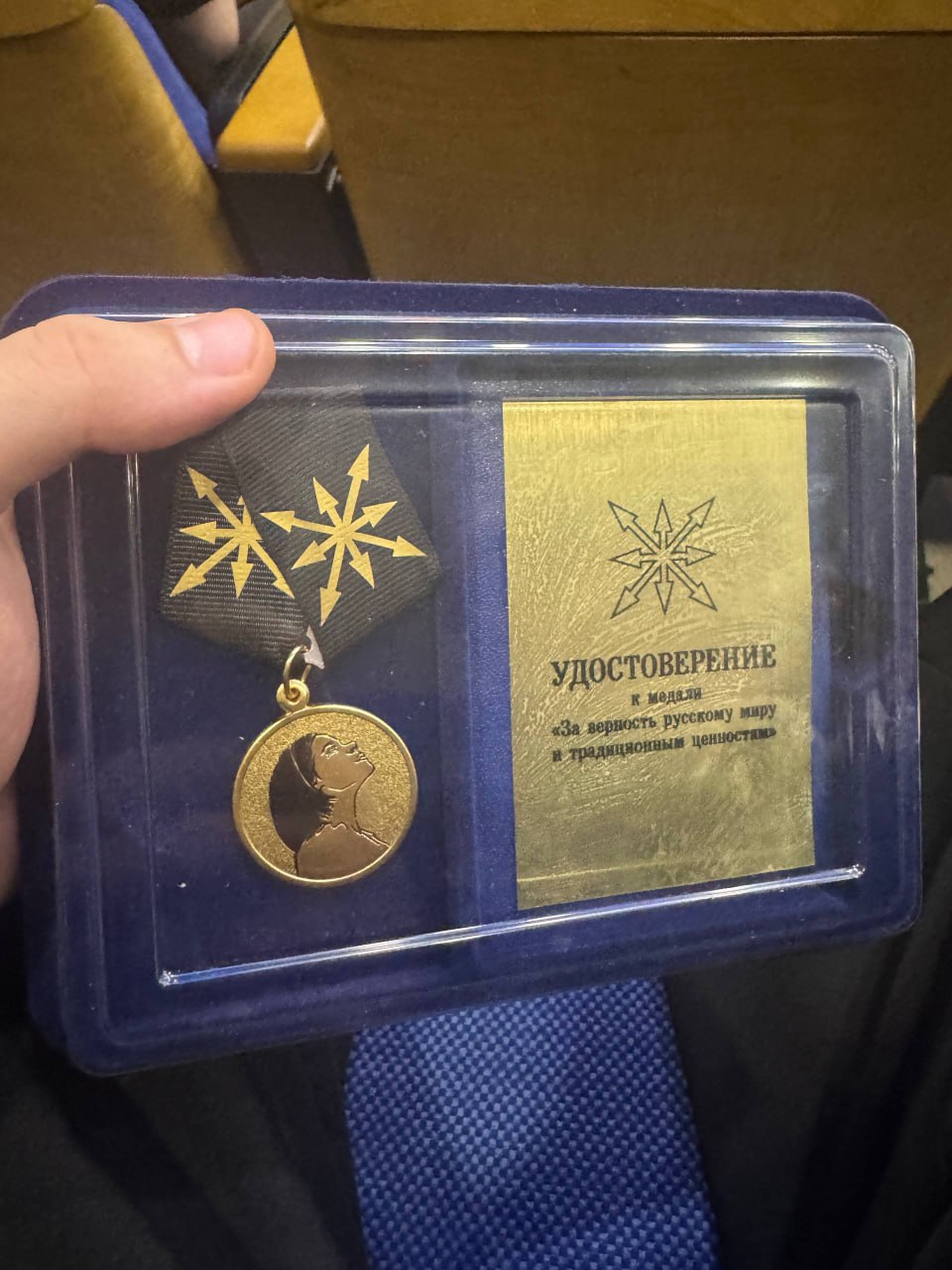 Воронежскому музыканту Артему Зацепину вручили медаль имени Дарьи Дугиной «За верность русскому миру и традиционным ценностям»