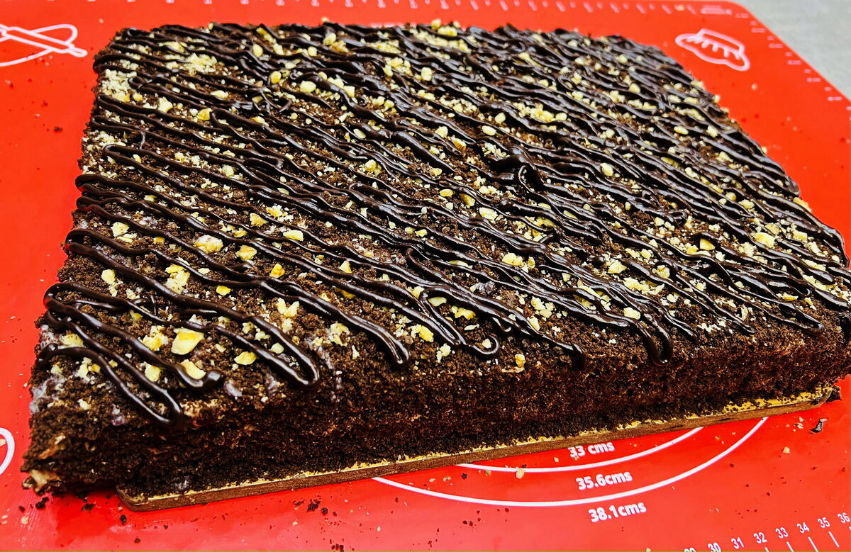 Теперь сборка торта: обрежьте края остывших коржей, пропитайте их сиропом, щедро намажьте кремом и украсьте бисквитной крошкой, орехами и шоколадом. Дайте торту немного настояться, чтобы все слои пропитались, и наслаждайтесь его восхитительным вкусом!