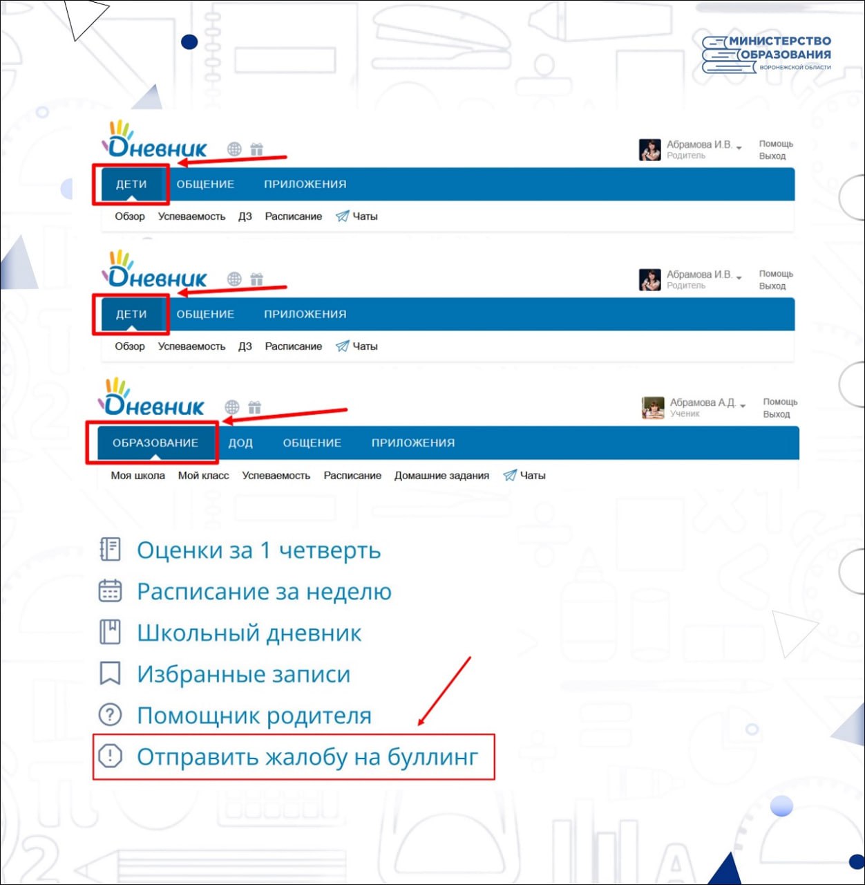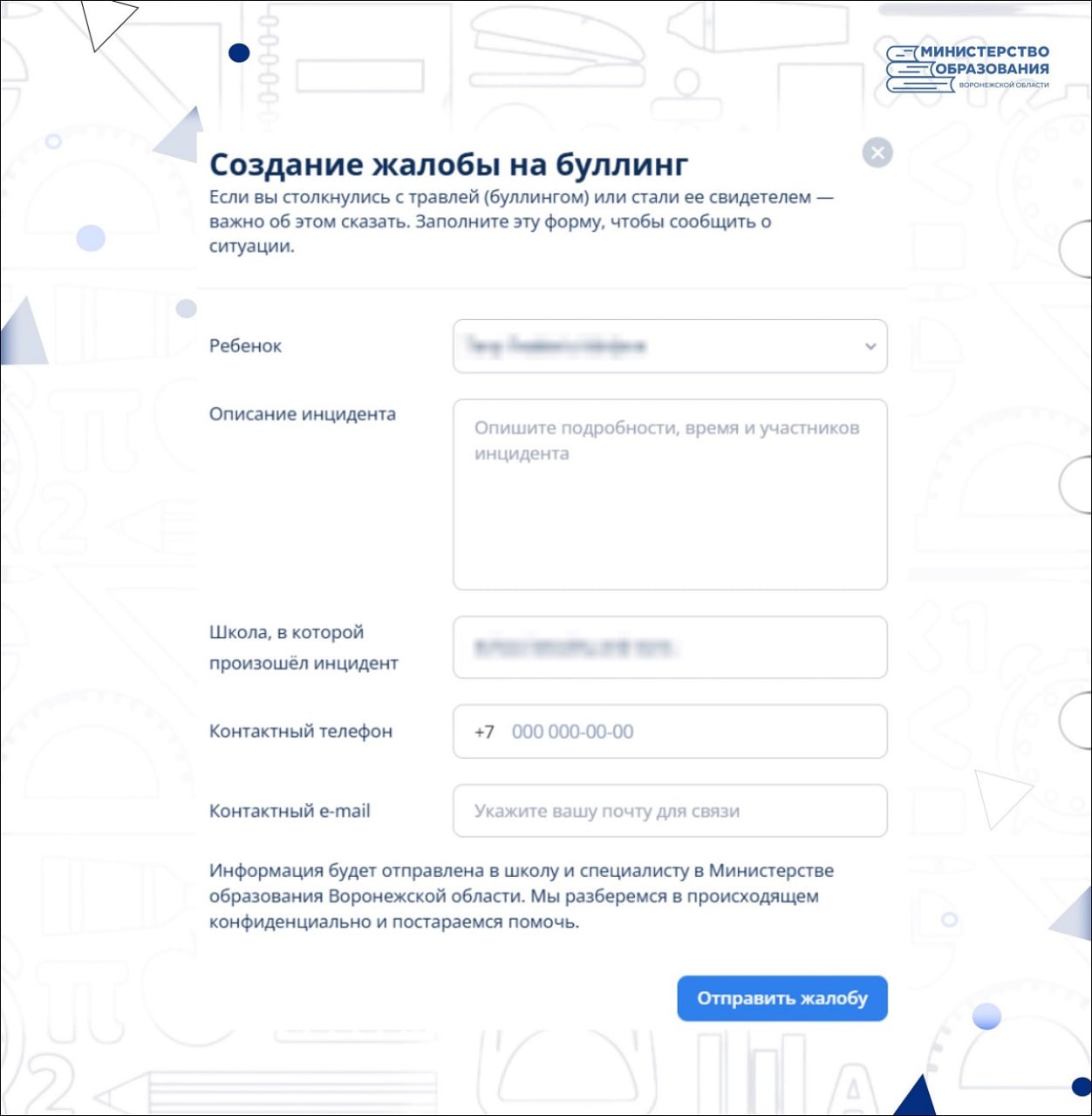 Ученики либо их родители смогут оперативно отправить сообщение о противоправных действиях через специальную форму обратной связи. Жалоба одновременно поступит в администрацию учебного заведения, а также в региональное министерство образования. Специалисты гарантируют конфиденциальность и рассмотрение каждого поступившего сигнала.