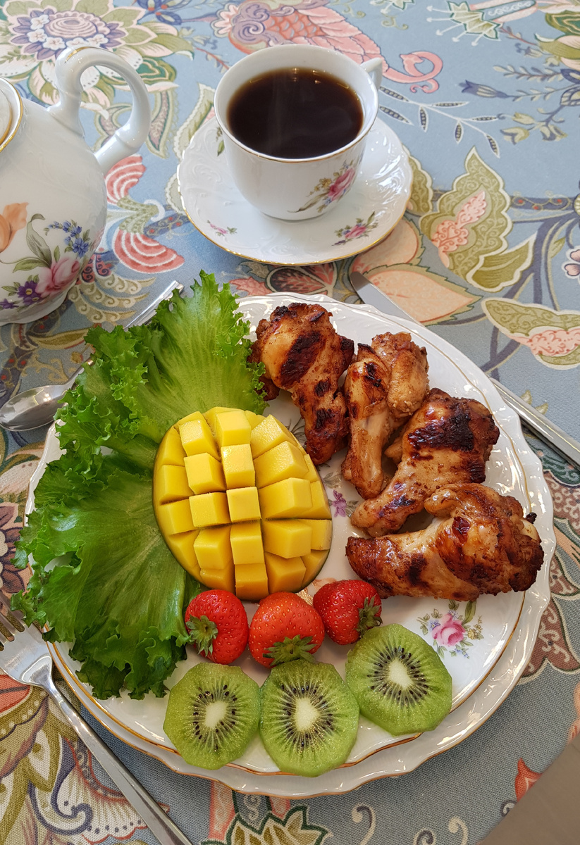 Готовые куриные крылья стоит выложить на тарелки, дополнить их свежими листьями салата, нарезанным манго, киви и клубникой. Это не только украсит блюдо, но и добавит свежести. Праздничный ужин или обед с этой вкуснятиной станет настоящим гастрономическим событием. Приятного аппетита!