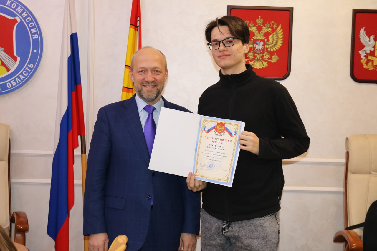 Председатель облизбиркома Илья Иванов поблагодарил членов МИК за активную просветительскую работу и личный вклад в проведение ЕДГ-2025: на выборах ребята проводили информирование избирателей, работали на «горячей линии» ИКВО и в качестве членов УИК. Их труд был отмечен грамотами облизбиркома и памятными подарками.
