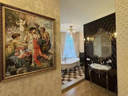 Самым дорогим предложением стала трехкомнатная квартира площадью 128 кв. м на улице Алексеевского, оцененная в 90 млн руб. Интерьер выполнен по индивидуальному проекту с использованием мрамора, итальянских текстильных обоев, штучного дубового паркета и керамогранита Versace. Мебель ручной работы была привезена из Италии, часть французских антикварных предметов прошла реставрацию с применением позолоты. Планировка предусматривает гостиную, объединенную с кухней (40 кв. м), основную спальню с гардеробной и собственной ванной комнатой, а также вторую спальню с отдельным санузлом. Дом расположен в пешей доступности от театров, концертных площадок, ресторанов, парков и Петровской набережной.