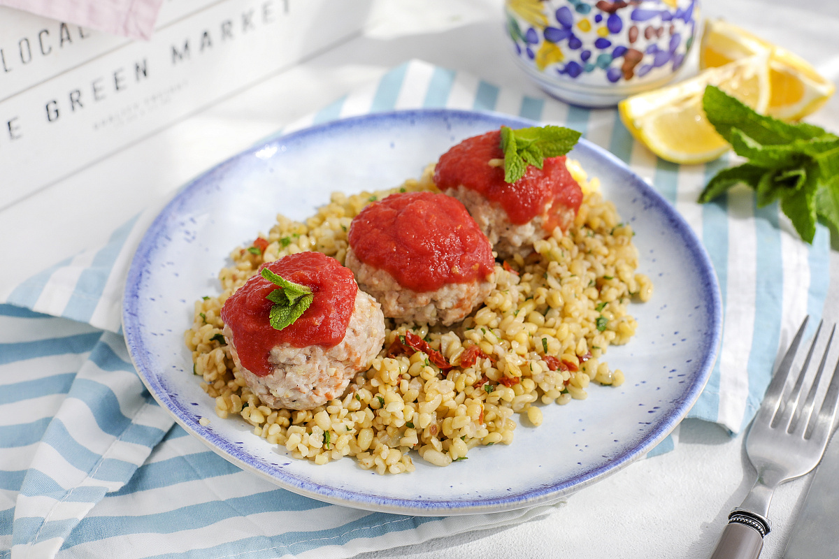 Шаг 3: Вяленые помидоры нарежьте, а зелень (мяту, кинзу и петрушку) мелко нарубите. Добавьте эту смесь в готовый булгур, тщательно перемешайте и подавайте к митболам вместе с ароматным соусом. Успех вашего новогоднего стола обеспечен!