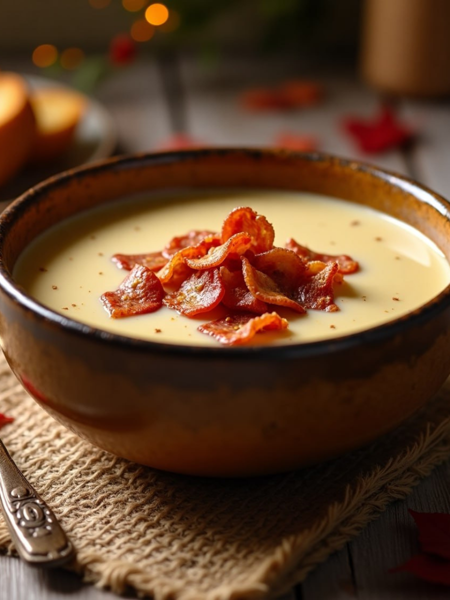 Разлив суп по тарелкам, не забудьте украсить его хрустящими чипсами из бекона и сухариками из белого хлеба. Наслаждайтесь восхитительным вкусом!