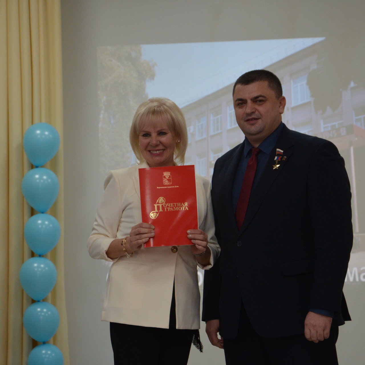 Заместитель председателя городской Думы Олег Черкасов подчеркнул, что постоянно оказывает поддержку школе, так как она расположена на его округе. Он вручил директору Ирины Париновой от себя лично и от депутата Воронежской областной Думы Владимира Верзилина два сертификата по 200 тысяч рублей на приобретение оборудования.