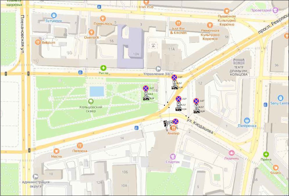 площади Ленина, улице Кардашова, Театральном проезде, проспекте Революции — от улицы Карла Маркса до площади Ленина.