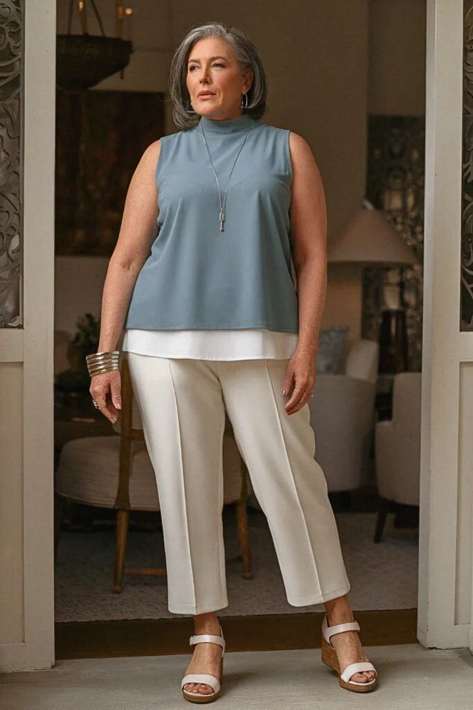 - Светлые укороченные брюки: Они визуально вытягивают силуэт. Главное — избежать обтягивающих моделей. Их можно сочетать с нежным топом и летней водолазкой. Легкие босоножки с танкеткой добавят изящества, а минимальные украшения будут лишь подчеркивать образ.