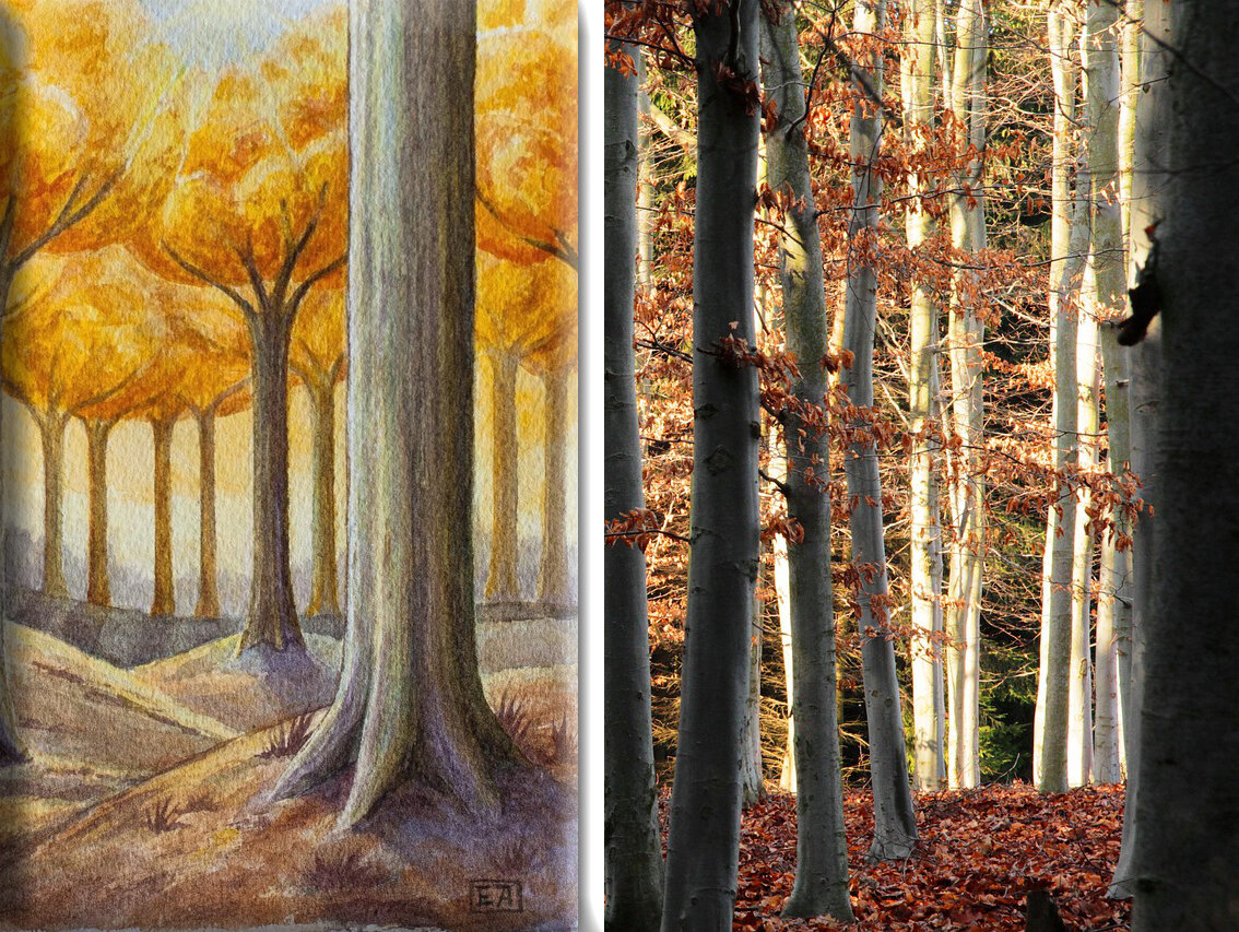Начнем с величественных мэллорнов — огромных деревьев с гладкой серебристой корой и золотыми осенними листьями. Листья таких деревьев весной и летом окрашиваются в светло-зеленый, а осенью открывают удивительное золото. Сходство с буком, который также имеет гладкую кору и яркие осенние оттенки, подтверждает, что природа вдохновляет мистические миры.