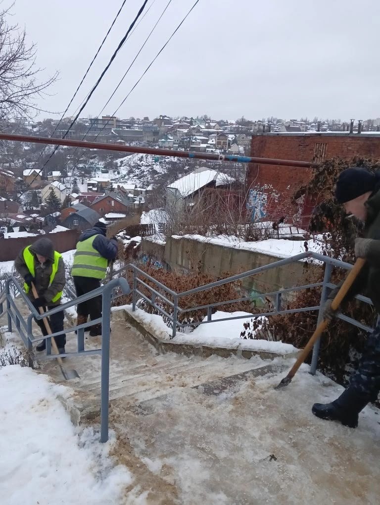 Специализированные бригады Комбината благоустройства регулярно проводят работы по очистке лестниц от снега, а также осуществляют обработку противогололёдными средствами.