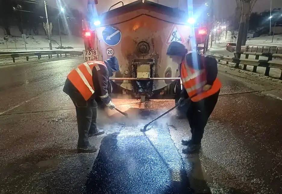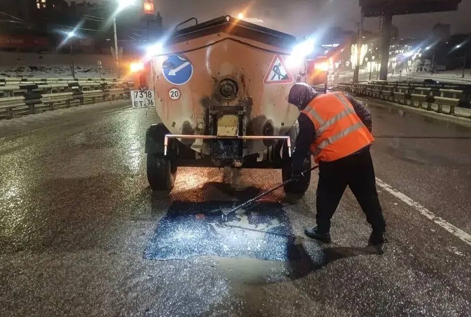 Сегодня в ночь комбинат благоустройства производил ямочный ремонт дорожного полотна литой асфальтобетонной смесью на отдельных участках Чернавского моста и Петровской набережной.
