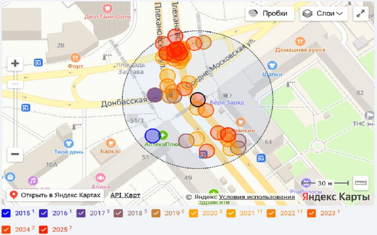 Воронеж - перекресток улиц Плехановской и Донбасской у площади Застава (58 аварий, 8,4 аварии в год за последние 5 лет);