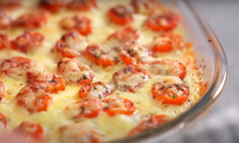 Чтобы запеканка была воздушной, взбейте яйца с молоком и вылейте получившуюся массу на рис и тунец. Сверху добавьте нарезанные пополам помидорки черри, посыпьте тертым сыром и приправьте базиликом. Запекайте в разогретой до 180°C духовке всего 20 минут — и ваш ужин готов!
