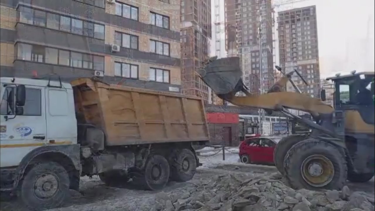 На Кривошеина, где застряли то автобус с трактором, то машина с песком, приехала более серьезная техника.