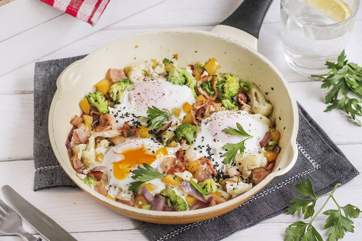 Вдохновленная легендарным супергероем, яичница Капитана Америки сочетает в себе питательные овощи и ароматный бекон. Для её приготовления на две порции потребуются следующие ингредиенты: