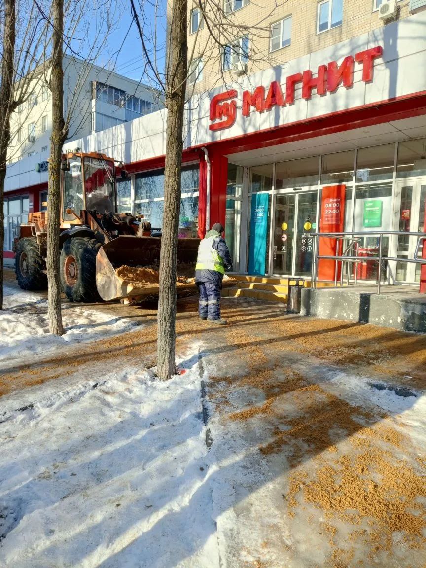 Наши специалисты оперативно приступили к уборке льда и обработке тротуара песко-соляной смесью.